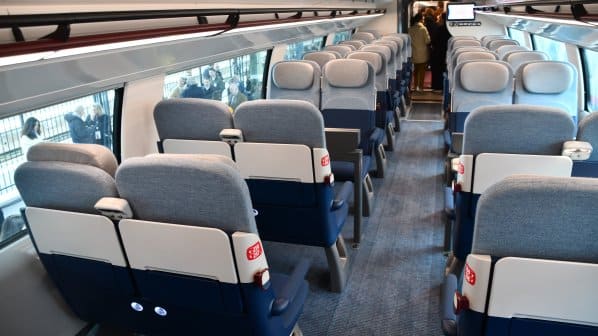 TGV M的內(nèi)飾以紅、白、藍三色為主色調(diào),即法國的國旗色。其中,一等座采用2+1配置,以紅色為主色調(diào),座椅比上一代寬50毫米,座椅靠背桌展開后可露出電源插座;二等座為2+2設(shè)計,以藍色為主色調(diào),二等座的空間非常寬敞,腿部空間比上一代多出50毫米。全新的座椅形狀更加圓潤,采用了新型輕質(zhì)透氣泡沫材料,并配合上含85%羊毛纖維的針織面料,更易于清潔和更換。座椅下方有足夠的空間存放較小的行李。