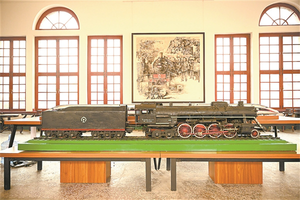 津浦鐵路泰安博物館內(nèi)陳列的蒸汽機(jī)車和復(fù)興號列車模型。