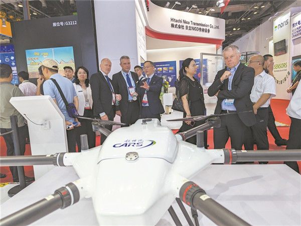 中國(guó)鐵道科學(xué)研究院集團(tuán)有限公司自主研發(fā)的鐵路長(zhǎng)續(xù)航多旋翼無(wú)人機(jī)吸引眾人目光。本報(bào)記者 唐克軍 攝
